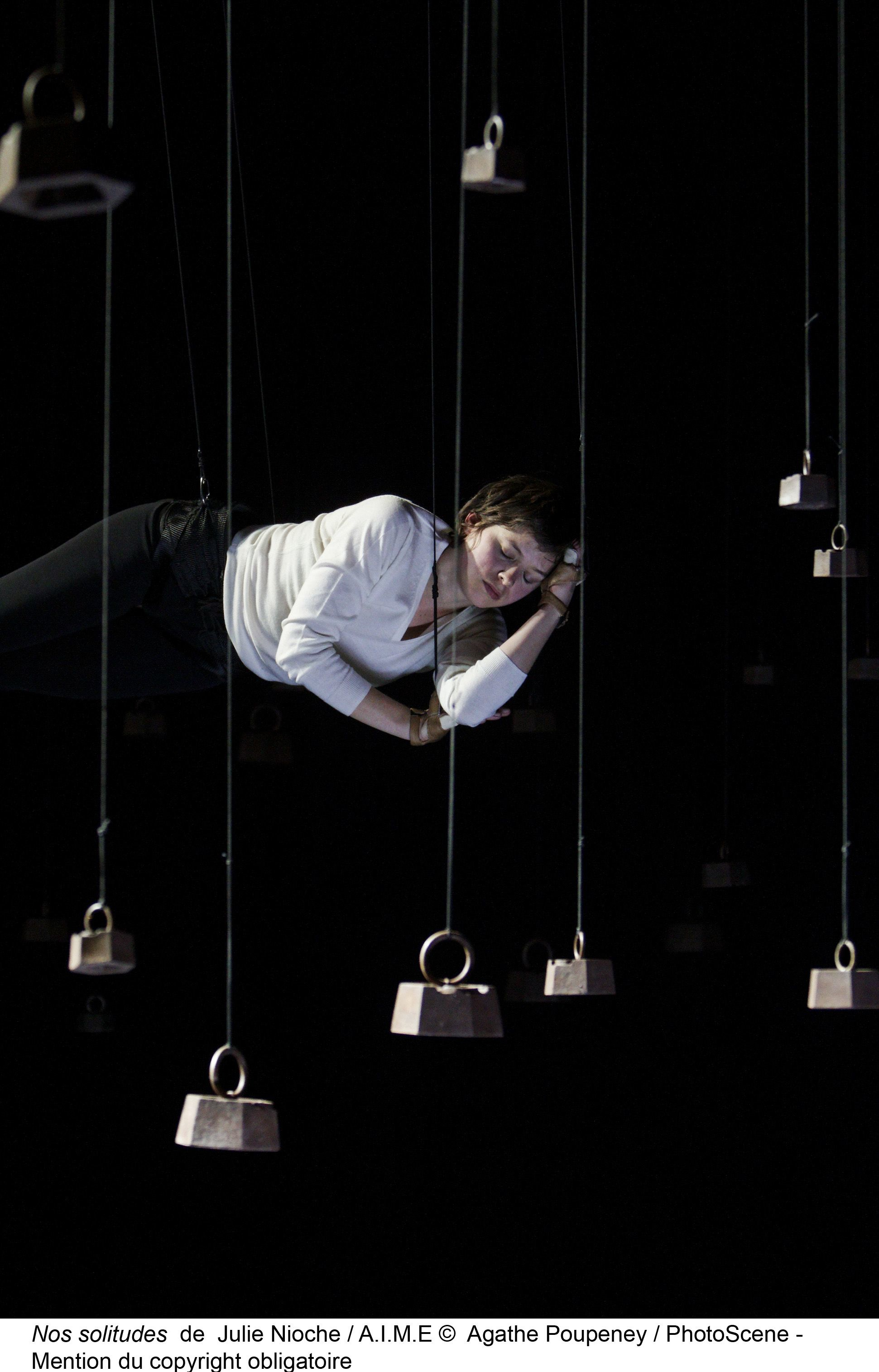 Nos Solitudes is like a continuous free fall in which a woman’s body is suspended in space, with different cables and pulleys attaching it to widely-spaced different weights and counterweights, weaving through the space and triggering some of the dance movements.