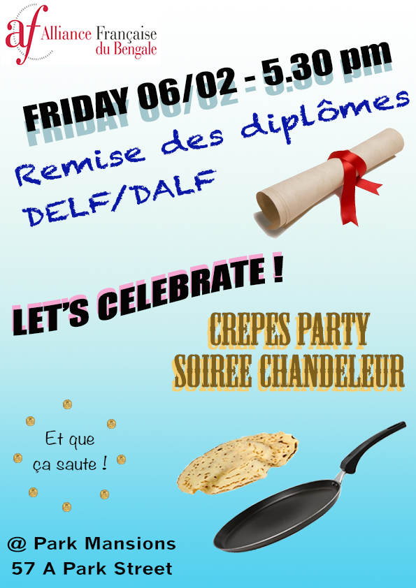Bravo to all our graduates of DELF/DALF exams! This week is Chandeleur (National Crepes Day) in France so come all to AfdB on Friday 6 January 5.30 pm to celebrate your graduation and pick up your diploma for June and September 2014 session around delicious crepes and music! Open to all our students, teachers and Alliance’s members.